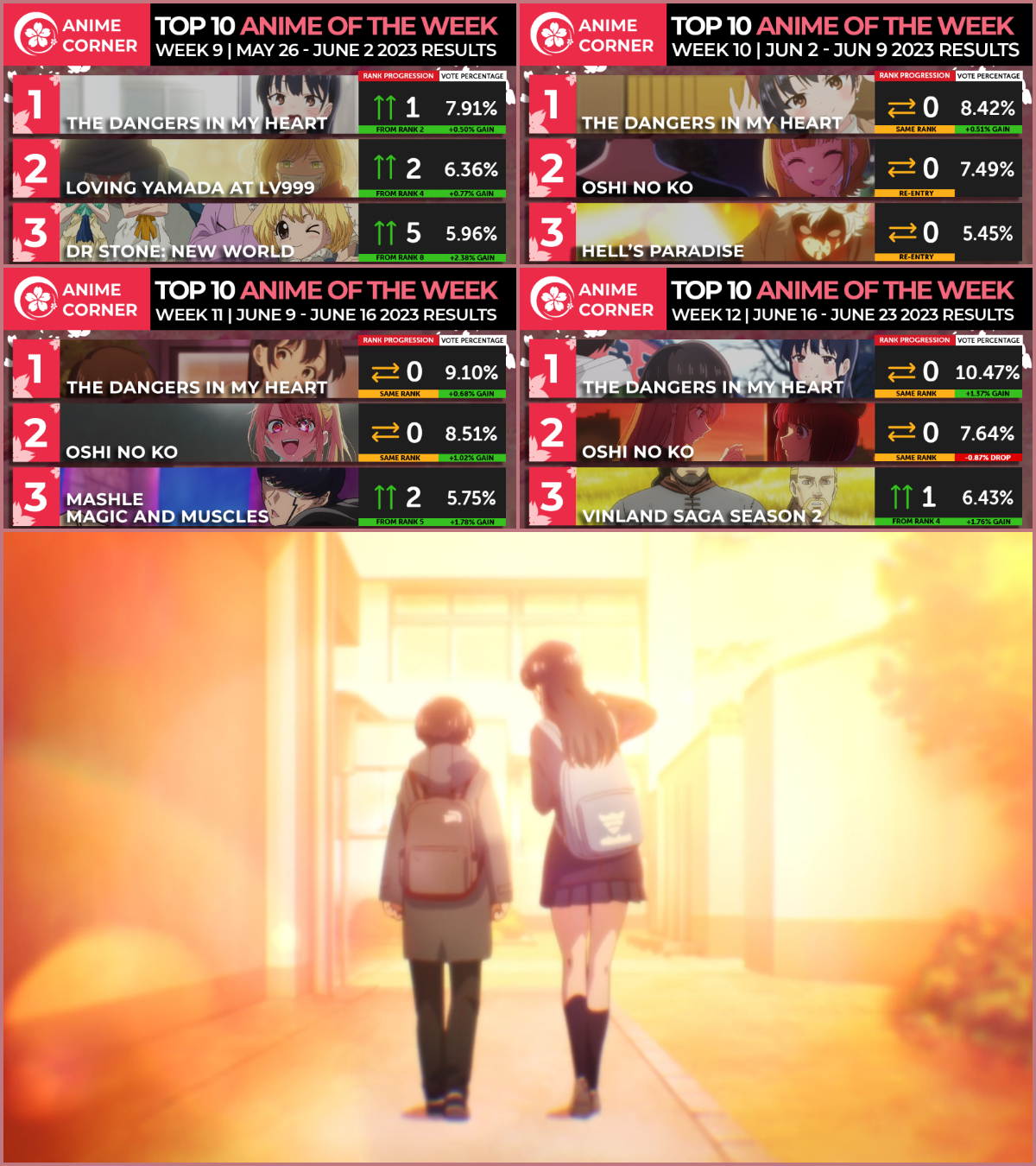 Prior to the historical achievement, the anime broke the record previously held by BLEACH: Thousand-Year Blood War (the anime was first for 9 weeks in a row back in Fall 2022, before Mob Psycho 100 broke its streak). You can see the vote percentage of The Dangers in My Heart Season 2 (Bokuyaba) over the season below.