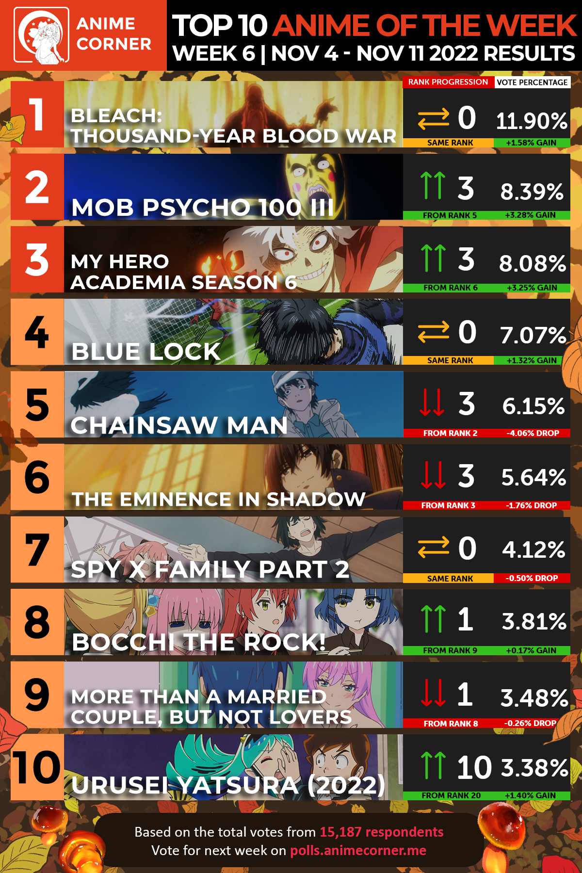 The sixth weekly anime corner poll for anime rankings in Fall 2022 is now closed! We compiled a list of fan-favorite episodes released during the sixth week of this season using data from over 15,000 international anime fans.