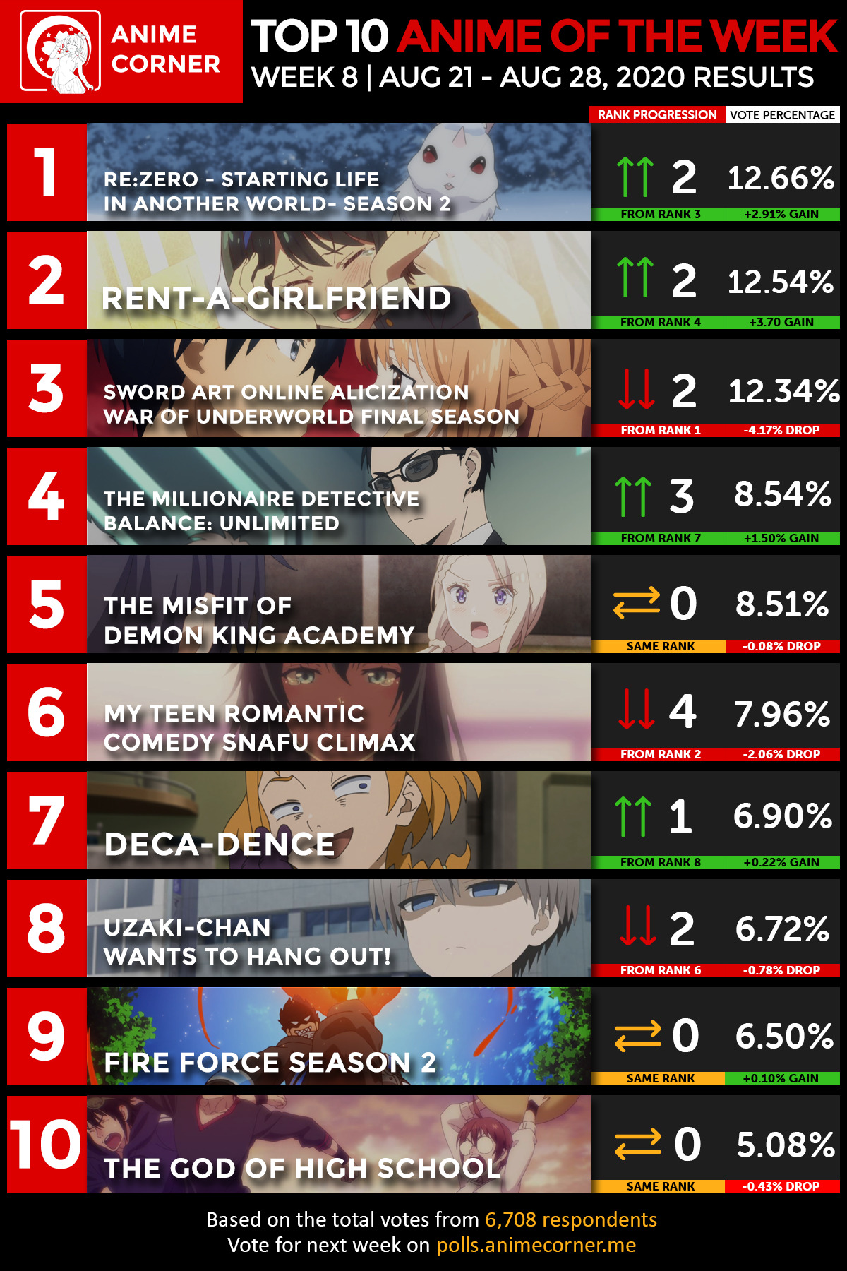 The results for Summer 2020’s eighth weekly anime corner poll for anime rankings have arrived! In case you missed the previous week’s poll results, don’t worry cause these will keep on coming! Subaru suffered possibly the worst death since the series started, and the fans obviously love to see him suffer. Kirito had the perfect chance to kiss Asuna and he managed to miss it, so his fall isn’t really surprising, while Kambe’s tragic family history got him back up. Kanokari made it into the Top 3 for the first time, and Ruka was almost enough to place first!